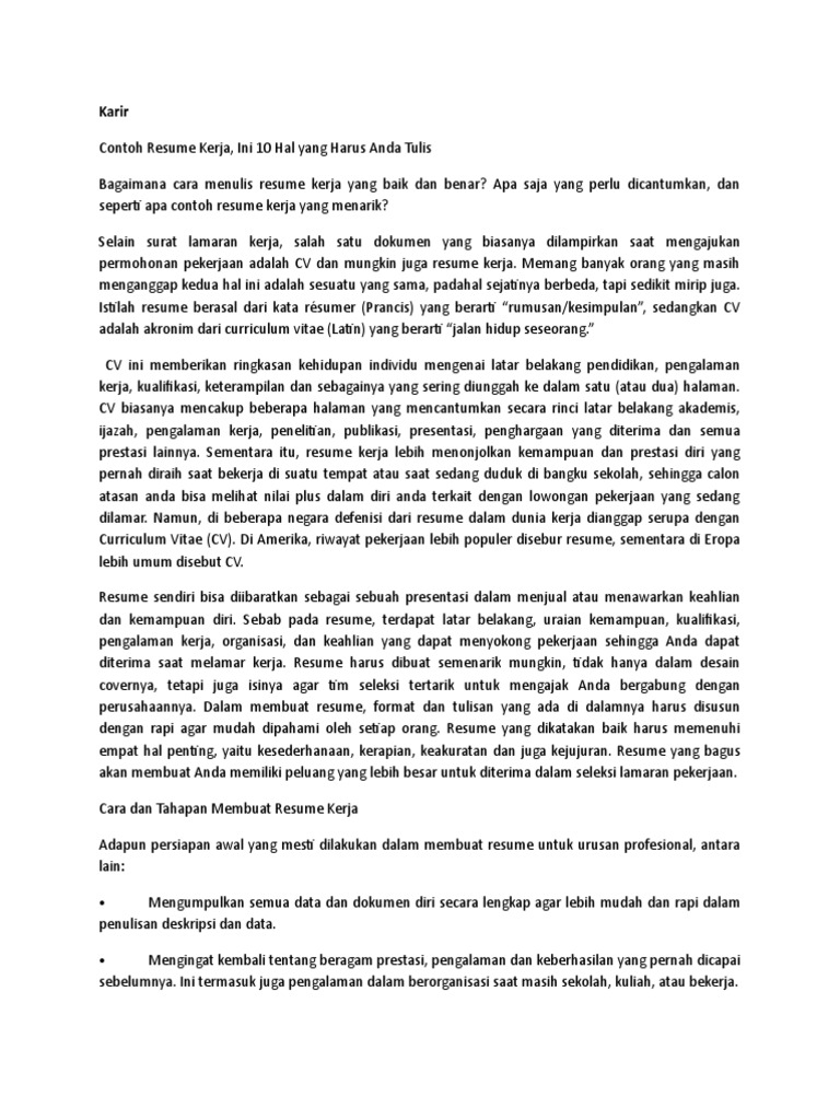 Penggunaan kata serta kalimat dalam sekain dan terima kasih sudah membaca mengenai pengertian resume, perbedaannya, cara membuat dan contohnya, semoga dapat bermanfaat. Saat anda keluar dari dunia pendidikan, anda diharuskan terjun ke dunia kerja. Contoh resume lamaran kerja lengkap terbaru dan terbaik 2021. _ demikianlah contoh resume kerja yang bisa anda terapkan untuk keperluan profesional anda. Resume yang bagus akan dapat membantu meningkatkan peluang untuk anda dipanggil untuk temuduga.
