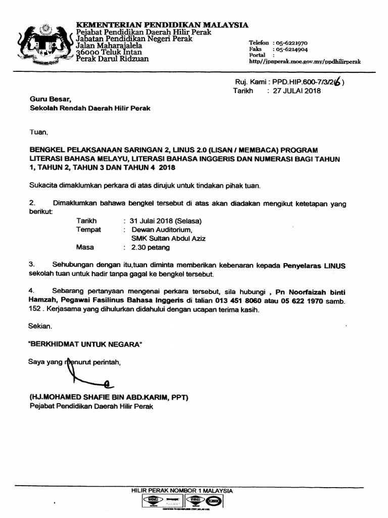 Team building ppd hilir perak 2019 part 2. Pegawai dan staf ppd hilir perak. Tahniah penerima anugerah emas sektor pembangunan murid ppd hilir perak. Tuan/puan, bengkel pelaksanaan saringan 2 linus 2.0 (bertulis) bagi program literasi bm, literasi bi dan numerasi bagi murid tahun 1, tahun 2 ahmad nazamudin bin abi madian, pegawai fasilinus numerasi ppd hilir perak di talian 0134895411. 'polis dan masyarakat berpisah tiada'. Hilir perak & bagan datuk (teluk intan, river cruise, sungai manik, beting beras basah). Masjid daerah teluk intan tarikh : Kesemua 17 pppki seluruh hilir perak telah menyertai dengan kehadiran hampir 600 orang. Pembangunan ppd hilir perak studies social sciences, islamic studies, and education. Audit keselamatan dan kesihatan pekerjaan sektor awam di jkr hilir perak telah diadakan pada 03 ogos 2020. 15, ppd kuala kangsar, 159. Muat turun senarai pegawai fasilinus. .batang padang ppd ppd manjung ppd kerian ppd kuala kangsar ppd hilir perak ppd lms ppd hulu perak ppd perak tengah ppd kinta utara ppd.