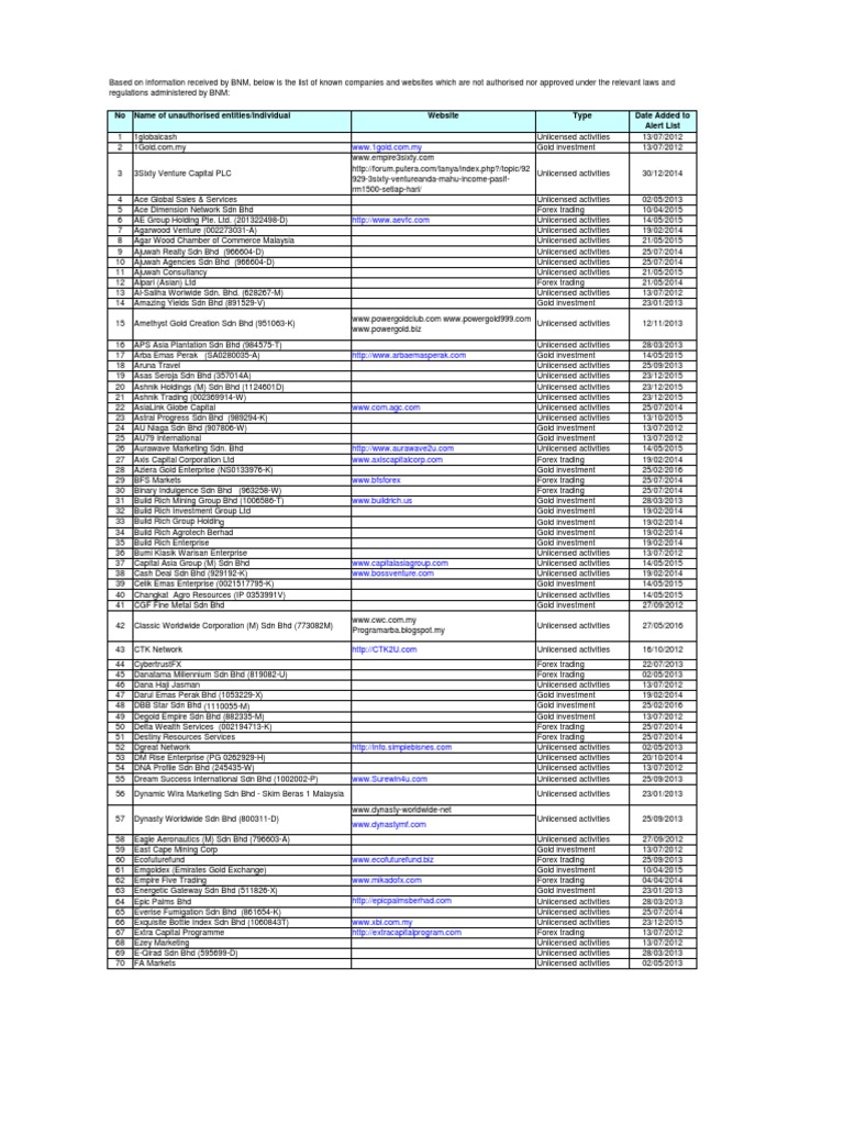 Credit rating is a concept that is still viewed negatively although it can improve one's financial standing. Persons carrying on or hold himself out as carrying on the following regulated activities without a licence from the sc: 7 ae group holding pte. Garuda indonesia operating as garuda indonesia formerly garuda indonesian airways is the flag carrier of indonesia headquartered at. Apr.28, 2015 in emgoldex, regulation. Bank negara has blacklisted 77 companies involved in unauthorised and illegal transactions amid reports of rm100mil being lost monthly to commercial crime. Tapi senarai ni tak lengkap dan akan dikemas kini dari semasa ke semasa. As a member of the united nations, malaysia is obliged to comply with the unsc's resolutions. And although bdig has allegedly been blacklisted by bnm and isn't licensed to do business here by sc, it is still operating with the help of manyyyy investors (you can check out those facebook pages and posts on bdig). The list only serves as a guide to members of the public based on information and queries received by bnm. Pilih paparan butang 'cetak laporan' dan ikut prosedur seterusnya; Bank negara malaysia blacklist company 2017. There is information on the site that expert users can use to make decisions and there is also information for the most novice of financial consumers.